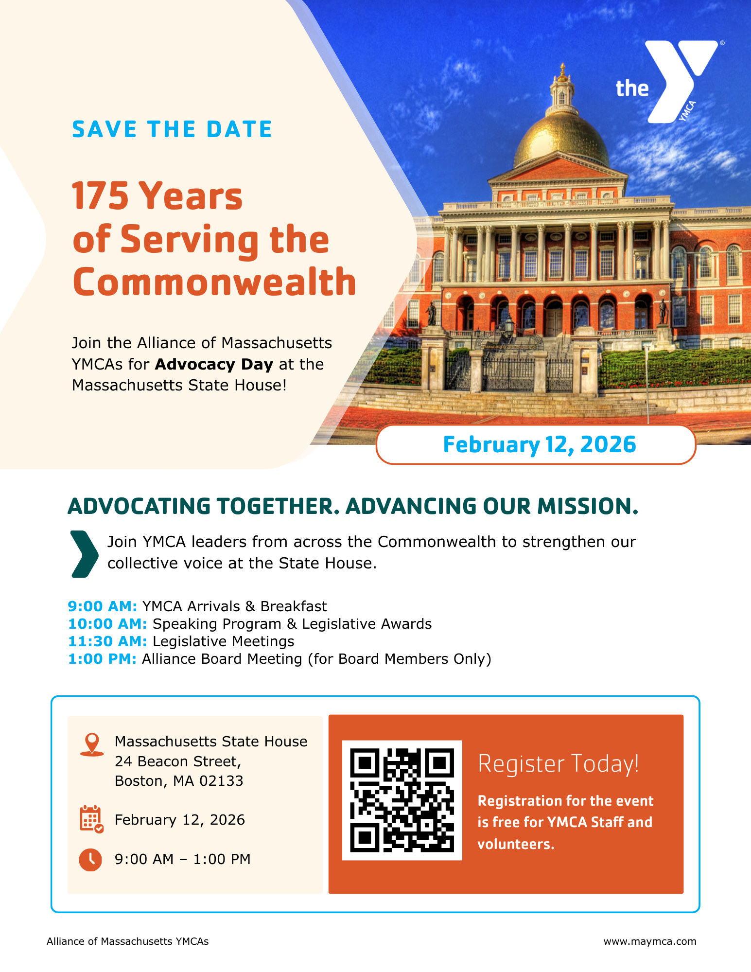 We’re excited to invite you to the 2026 YMCA State Advocacy Day, taking place on Thursday, February 12, 2026, at the Massachusetts State House. This year is especially meaningful as YMCAs across the country celebrate a historic milestone. In honor of this moment, the theme of this year’s Advocacy Day is “175 Years of Serving the Commonwealth.”